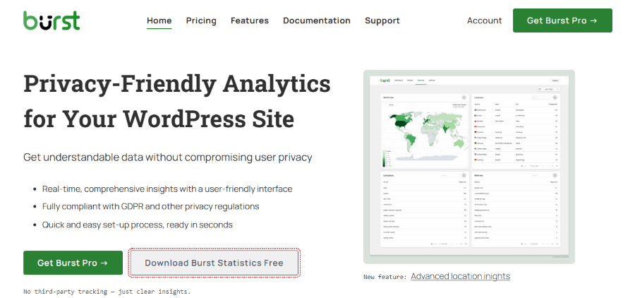 What makes Burst unique is its “Turbo Mode,” which optimises how data is collected to ensure that tracking your visitors has virtually zero impact on your PageSpeed Insights score. It stores all data locally on your server, ensuring you have 100% ownership and zero third-party data leaks. It’s the perfect middle ground for someone who wants more detail than Jetpack Stats but doesn’t want the bloat of a full Google Analytics integration.