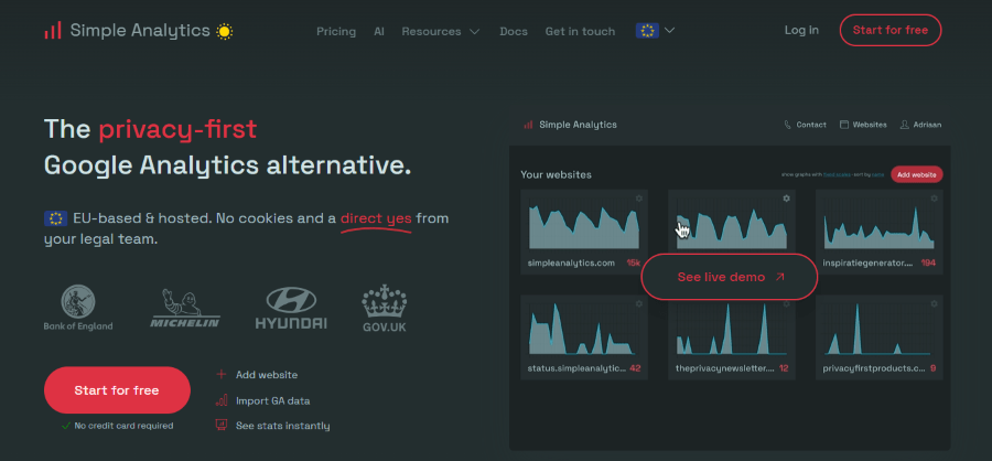 Simple Analytics lives up to its name by offering one of the most straightforward and ethical tracking solutions on the market. While most analytics platforms try to find workarounds to track users, Simple Analytics takes a hard stance: it does not use cookies, does not collect IP addresses, and does not fingerprint visitors. This “privacy-by-design” approach means you can completely remove annoying cookie consent banners from your site, providing a cleaner user experience while remaining 100% compliant with global regulations like GDPR, CCPA, and PECR.