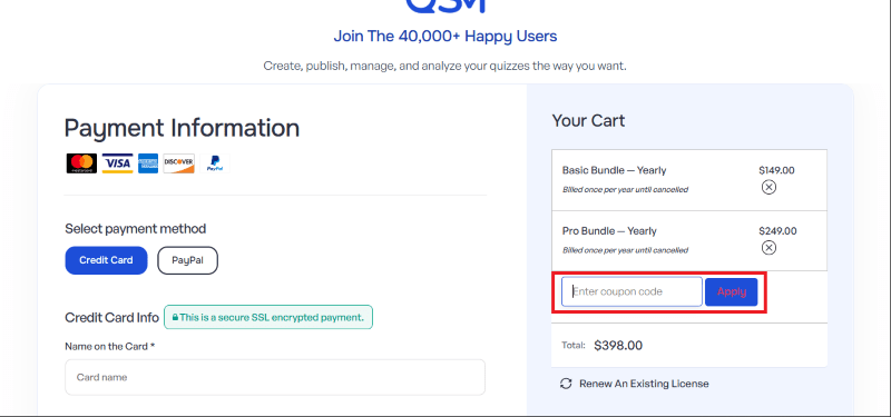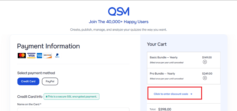 Schritt 2: Klicken Sie auf der Quiz and Survey Master Checkout-Seite auf das Feld für einen Promotion-Code (oder klicken Sie auf die Schaltfläche “Grab the Deal”).