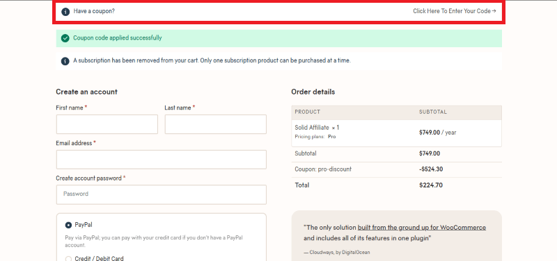 Schritt 2: Klicken Sie auf der Checkout-Seite von Solid Affiliate auf „Have a Coupon“ (Haben Sie einen Gutscheincode?).