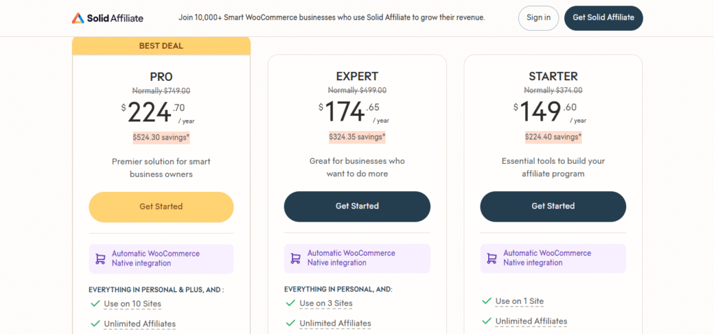 Schritt 1: Gehen Sie zur Solid Affiliate Preisseite und wählen Sie den Plan aus, den Sie kaufen möchten.