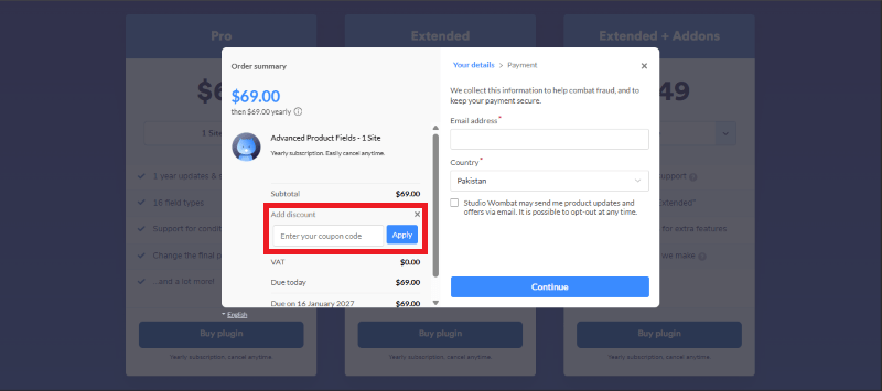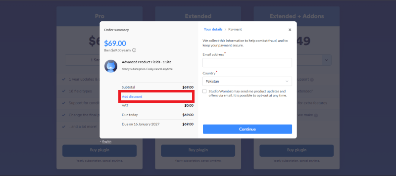 Step 1: Go to the Advanced Product Fields for WooCommerce page and select the plan you want to buy.