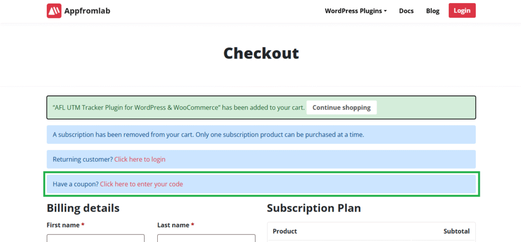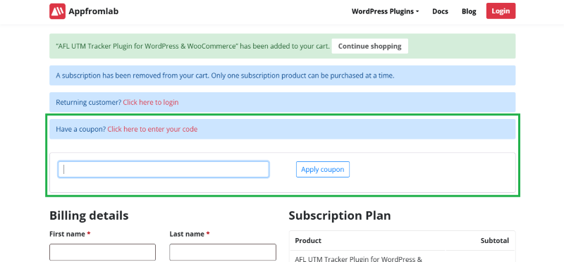 Step 2: On the AFL UTM Tracker Coupon checkout page, click on “Have a Promotional code”