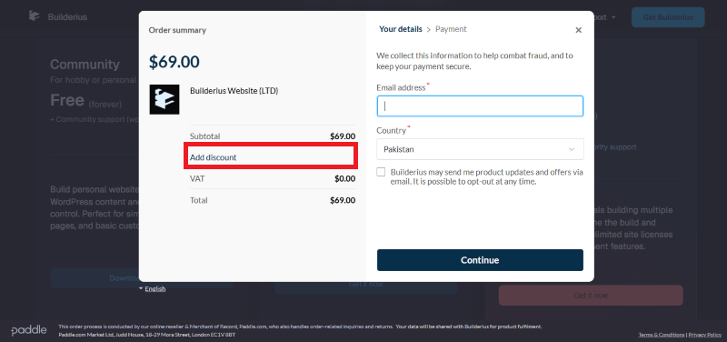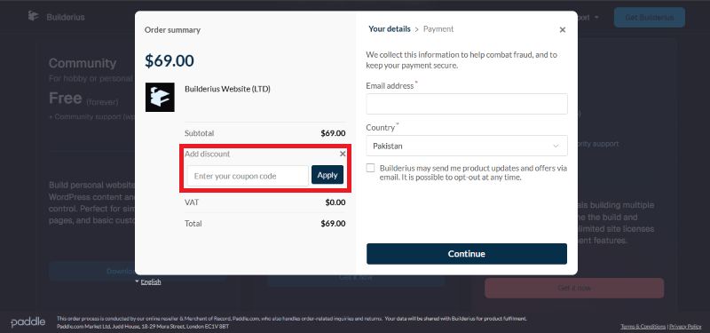 Step 2: On the Builderius checkout page, click on “Have a Promotional code”
