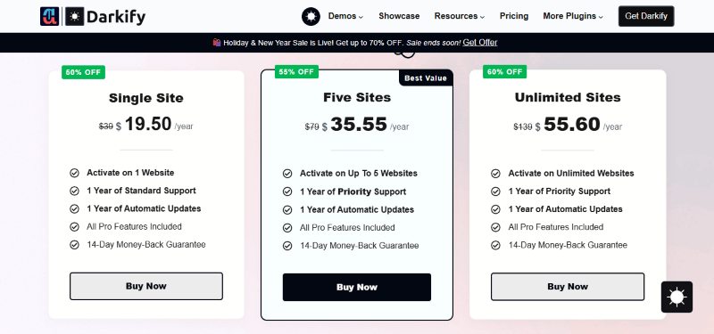 - Frontend & Admin Dark Mode: Unlike basic plugins, Darkify allows you to enable a sleek dark interface for both your visitors and your own WordPress backend dashboard.