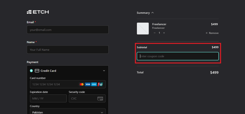 Step 2: On the Etch for WordPress checkout page, look for the field for a promotional code.
