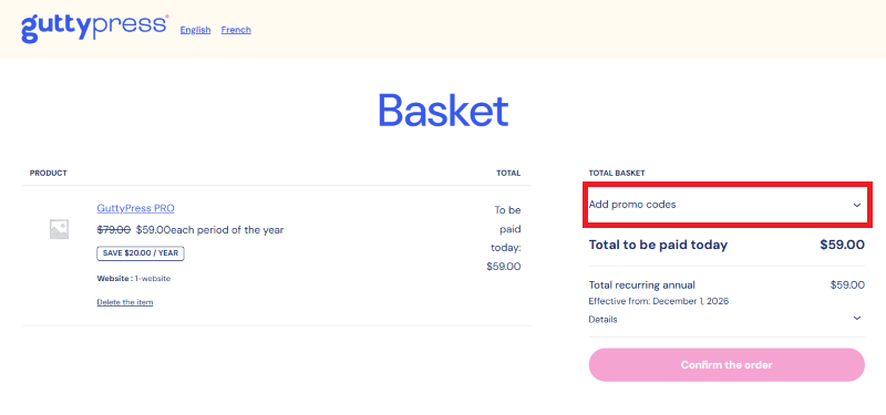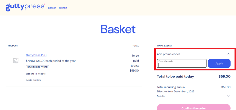 Step 2: On the GuttyPress checkout page, click on “Add Promo codes”