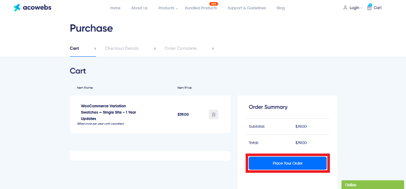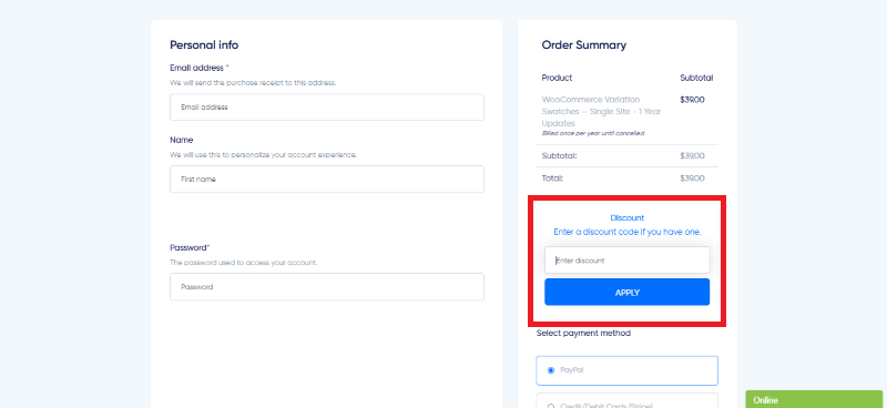 Step 2: On the Variation Swatches For WooCommerce Coupon, click on Place your order.