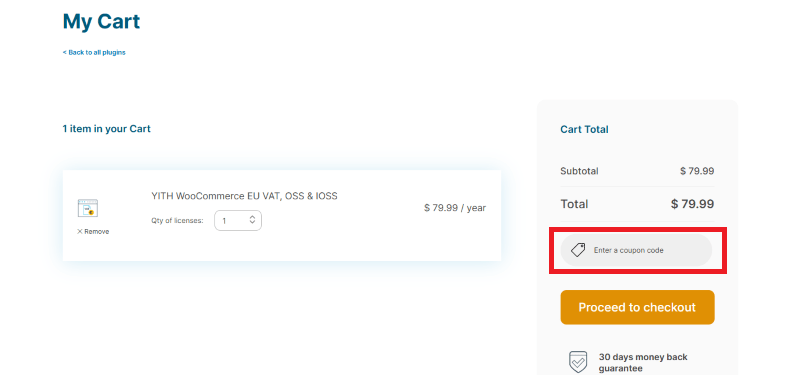 Step 2: On the YITH WooCommerce EU VAT, OSS & IOSS checkout page, click on “Enter a Coupon code”